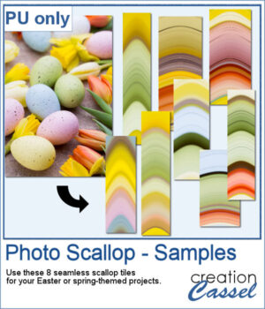 The Photo Scallop script for PaintShop Pro lets you turn any photo into seamless scallop patterns with soft, flowing curves. Each run generates multiple tiles based on different parts of your image, giving you a variety of coordinated color palettes. Use them as full papers, borders, or combine them for more creative designs.