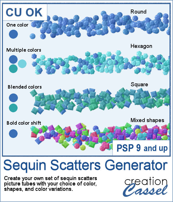 The script generates a full set of picture tubes containing 81 individual cells, giving you plenty of natural variation when scattering sequins on your projects. Because the tubes are generated from your own choices, you can easily create different looks to match each project.