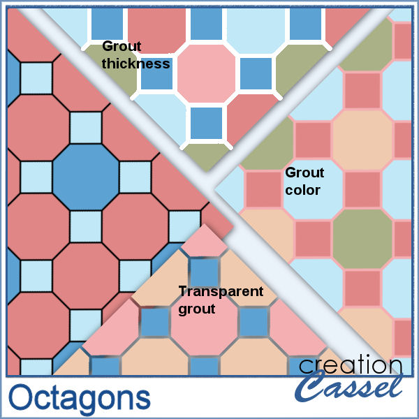 Create endless geometric papers with the Octagons script for PaintShop Pro. This script automatically generates seamless tiles based on an octagonal design, using the colors from your own palette. Each tile is built with a combination of octagons and diamond shapes that create a striking geometric pattern suitable for scrapbook pages, backgrounds, and digital design projects.