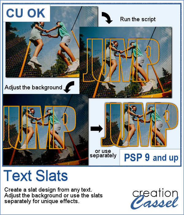 Create eye-catching text effects that highlight your photos with the Text Slats script for PaintShop Pro.